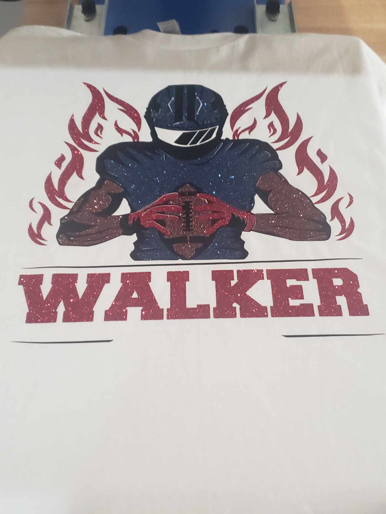 At Checkout notate color shirt you would like, color of the school for the glitter, name if you want to add, also the name of the school and football number